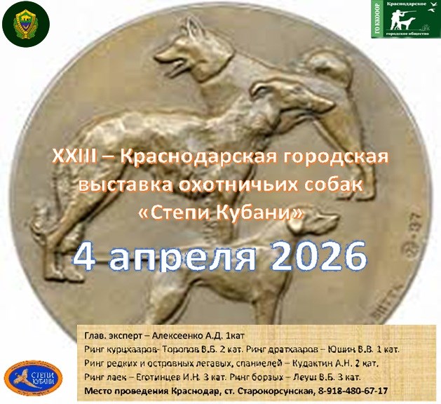 ХХIII-я Краснодарская городская выставка охотничьих собак пройдет 04 апреля 2026 года. Место проведения: г. Краснодар, ст. Старокорсунская, берег Краснодарского водохранилища.